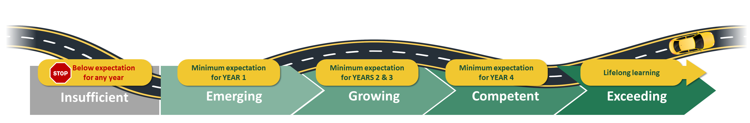 - In Years 2 and 3, students must achieve Growing in each competency and overall in the final evaluation.