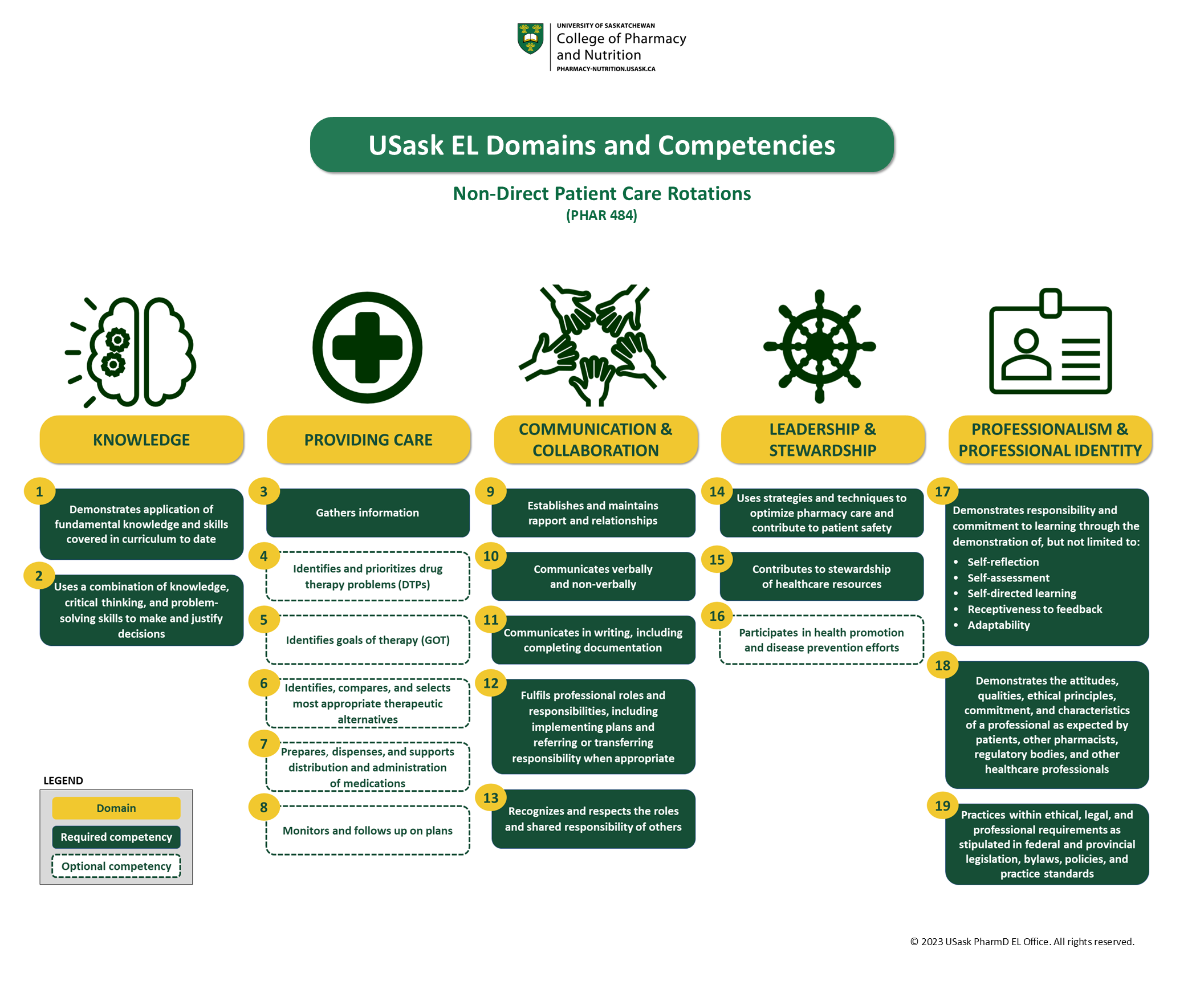 The same 19 USask EL competencies are used to evaluate students in non-direct patient care rotations. Thirteen of the competencies are required and 6 are optional, as applicable to rotation activities.