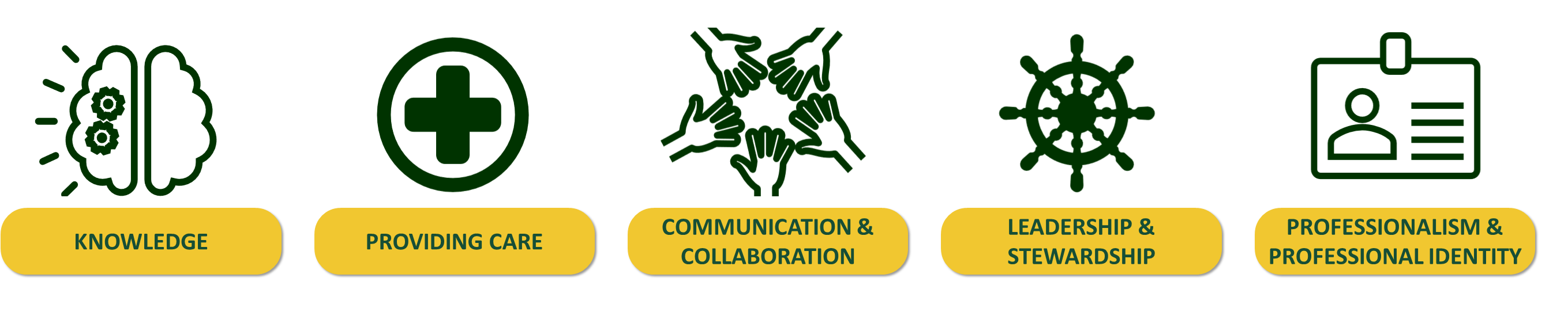 Under each domain, USask EL competencies specify the knowledge and skills that must be assessed in the rotation. There are 19 in total, as outlined in the graphics below. All 19 USask EL competencies must be assessed in each direct patient care rotation.