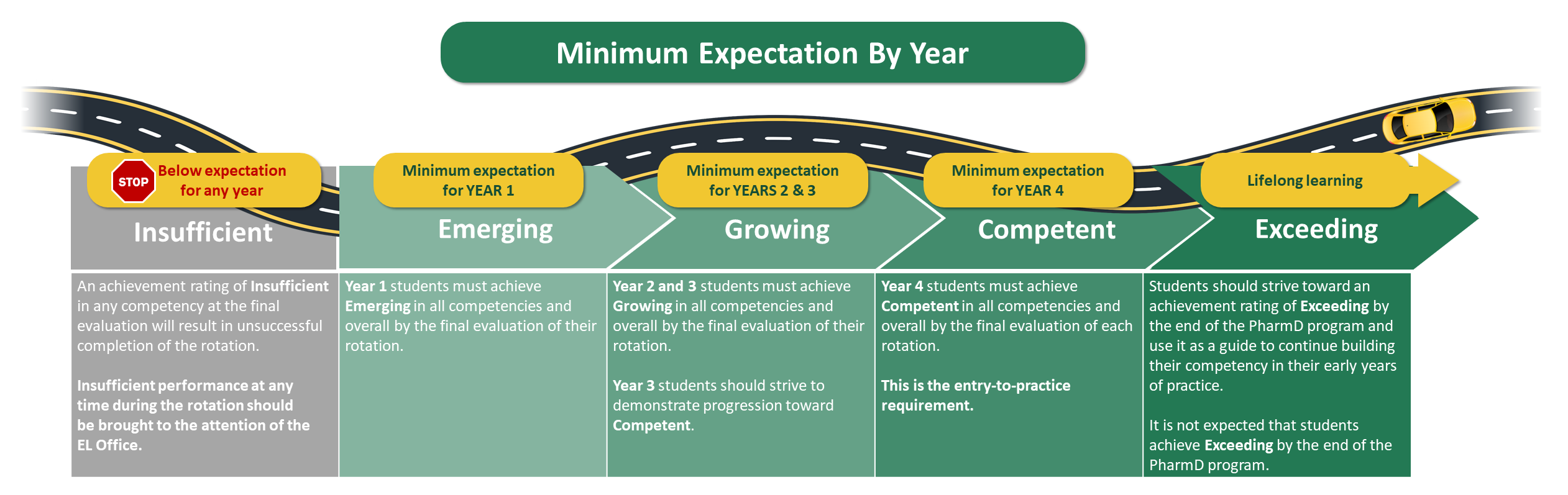 The information presented on this page is specific to the assessment framework and evaluation strategy used in IPPE and APPE rotations. While the evaluation form is the same, the minimum expected level of achievement required to pass the course increases each year.