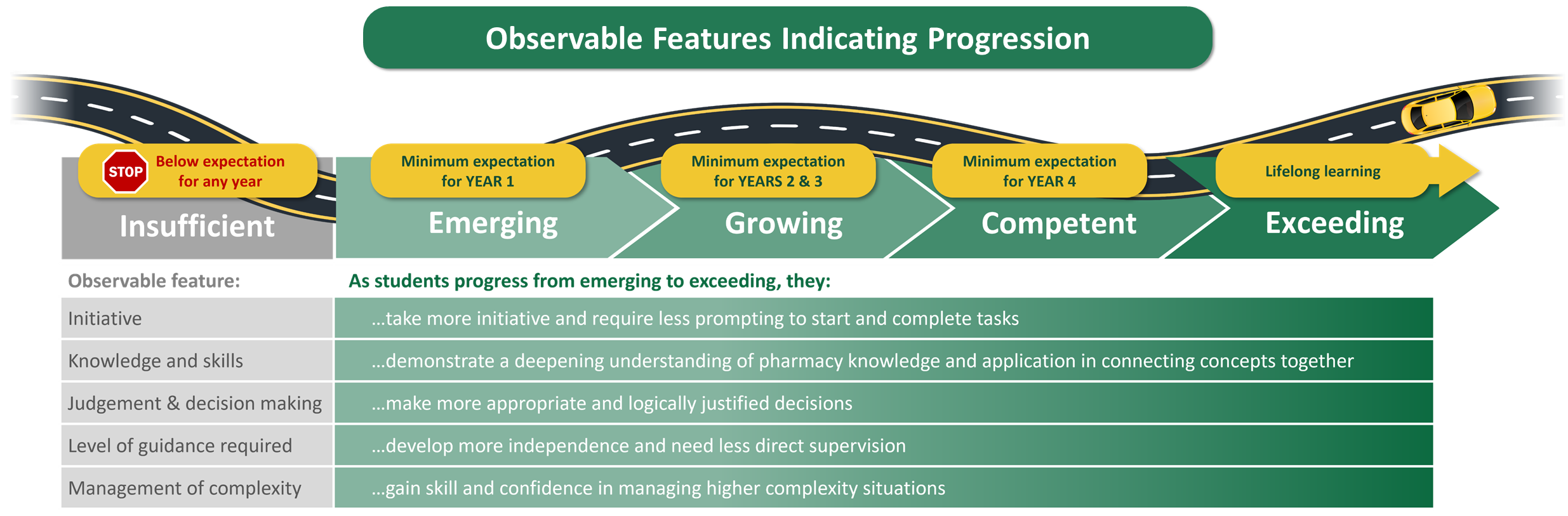 A student’s ability to demonstrate the knowledge, skills, attitudes, and behaviours of an entry-to-practice pharmacist is expected to develop with time, exposure, and practice as they progress through the PharmD program. Students will develop from Emerging to Growing to Competent as they gain experience in EL rotations, didactic courses, and work experiences outside of school.