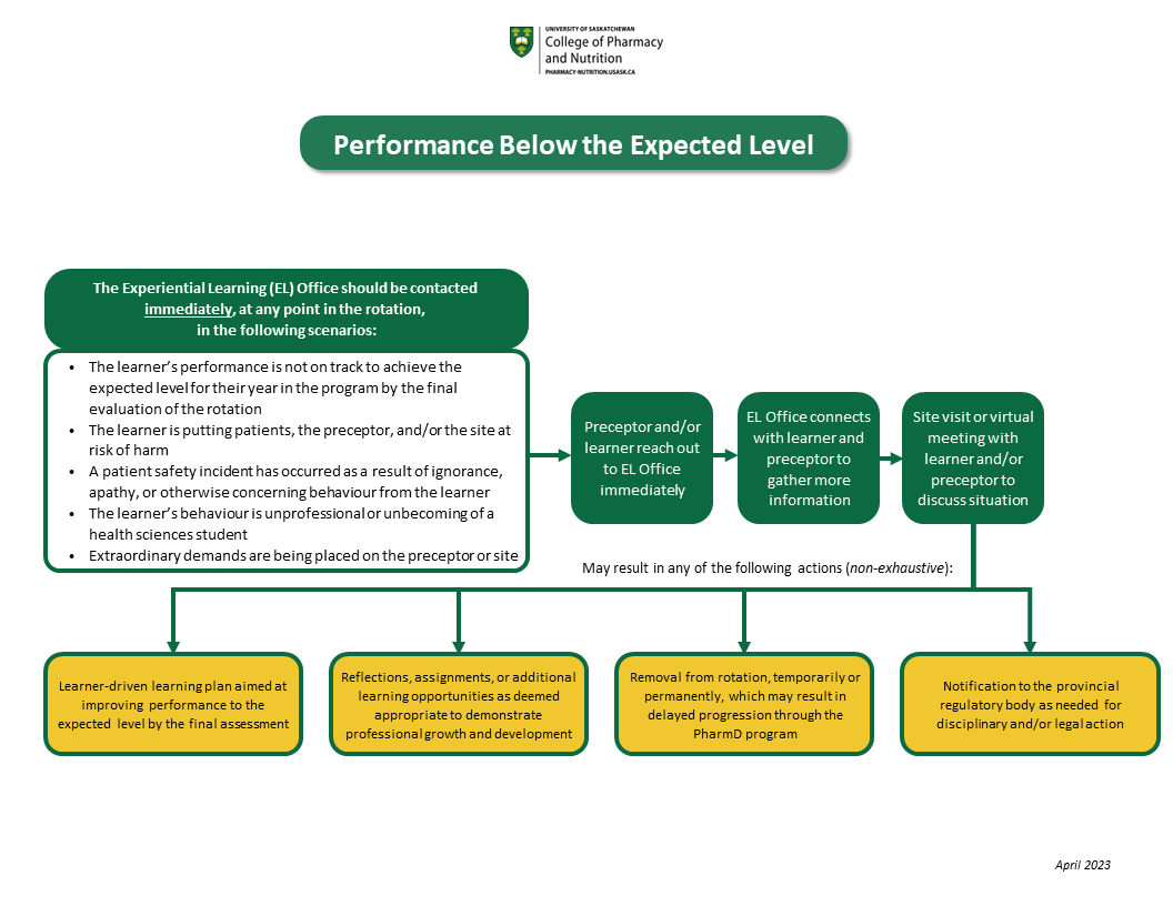Please note this assessment framework does not apply to PHAR 189 Service Learning, PHAR 188, PHAR 288, and PHAR 388 immersion courses. Information about assessment and evaluation in those courses is covered for preceptors in the course-specific Placement Modules in the USask PharmD Preceptor Training and Development Program, and for students in their course orientation presentations and syllabi.