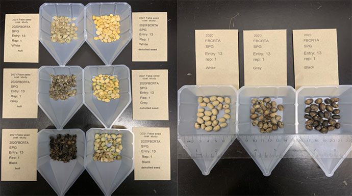 The primary objectives of this study are to investigate the biochemical diversity present in faba beans and their seed coats with the aim of uncovering potential added value. This involves characterizing and identifying metabolites in both grain-type faba bean seeds and their seed coats. Furthermore, it aims to characterize and identify metabolites from vegetable-type faba bean seeds and crosses derived from collaborative research. Ultimately, the study seeks to discern significant differences in metabolite profiles across all types of faba bean seeds and seed coats and correlate these findings with biochemical assays, thereby shedding light on the intracacies of the biochemical pathways.
