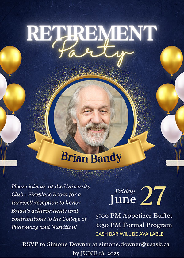 The College of Pharmacy and Nutrition is pleased to announce the retirement of Dr. Brian Bandy, Professor in the Division of Nutrition and Dietetics, effective June 30, 2025.