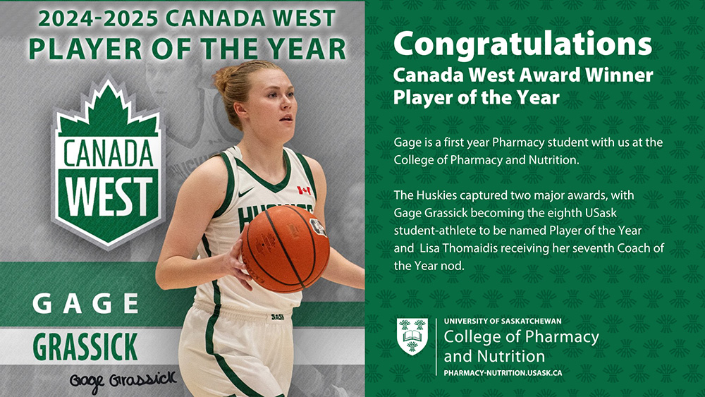 Canada West announced the Major Award winners for the 2024-25 women's basketball season, and for a sixth consecutive season the Huskies are represented among the conferences best. This year, the Huskies captured two major awards, with Gage Grassick becoming the eighth USask student-athlete to be named Player of the Year and Lisa Thomaidis receiving her seventh Coach of the Year nod.