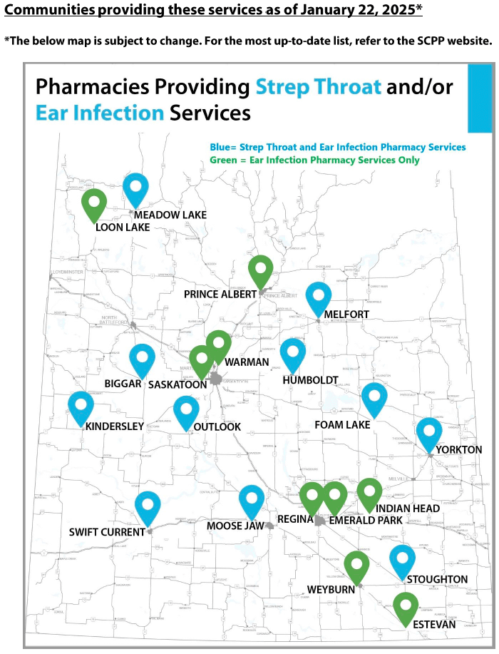The Saskatchewan College of Pharmacy Professionals offers a list of pharmacies offering strep throat and ear infection services in Saskatchewan.