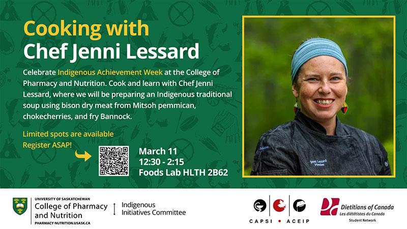 By Jason BelhumeurWe celebrated Indigenous Achievement Week at the College of Pharmacy and Nutrition, by cooking and learning with Chef Jenni Lessard. We prepared an Indigenous traditional soup using bison dry meat from Mitsoh pemmican, chokecherries, and Bannock. Thank you to Chef Jenni and Cree Longjohn.